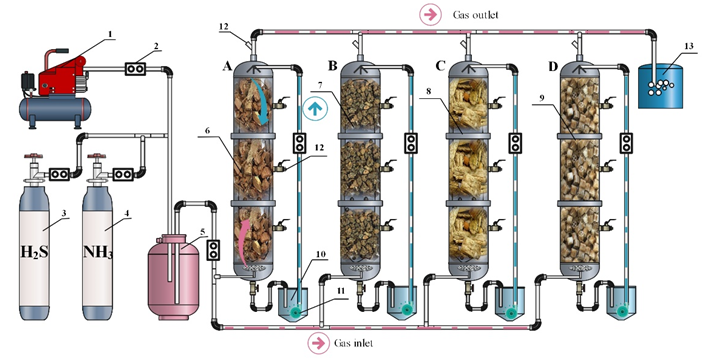 中国科学院成都生物研究所污染生物治理项目组研究生宦臣臣在吕青阳博士、闫志英研究员的指导下,以混合营养条件为基础,采用松树皮、煤渣、秸秆和移动床生物膜反应器(MBBR)作为填料,同时处理高浓度的H2S和NH3混合废气。结果表明,在H2S和NH3的进气负荷为53.59 g/m3·h,空床停留时间(EBRT)为40.5 s的条件下,以松树皮为填料的BTF-A去除率最高,分别为86.31%和94.06%。通过动力学曲线拟合得到理论最大负荷为90.09 g H2S m-1·h-1和172.41g NH3 m-3·h-1。同时,当NH3的进气浓度为720ppm时,BTF循环液中NO3-平均浓度仅为127.58 mg/L,二次污染物控制效果较好。对反应器中微生物分析发现,Dokdonella、Micropruina、Candidatus_Alysiosphaera、Nakamurella和Thiobacillus在属水平上具有较高的丰度,在4个BTF反应器中的整体比例分别为62.87%、46.32%、47.98%和57.35%。值得注意的是,在4个反应器中,具有HN-AD功能的菌株Comamonas和Trichococcus的占比分别为3.66%、1.45%、5.43%和3.23%。研究成果为生物滴滤反应器(BTF)在混合营养条件下有效去除恶臭气体提供了理论和实践依据。