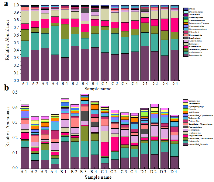 图4 BTF系统在门水平(a)和属水平(b)的微生物丰度图