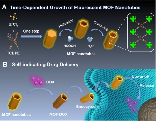 中国科学院成都生物研究所天然产物研究中心邵华武研究员课题组与南方科技大学蒋兴宇教授课题组合作通过对MOFs前驱参数的调控,已成功制备出具有强荧光性能的空心MOF纳米管,且可用于自我指示的药物递送。在一步合成过程中,通过监控反应的进行,发现该空心的六边形纳米管经历了自模板的生长以及随后的凹陷进化过程,这揭示了空心结构的形成是动力学的而不是热力学的,该MOF的合成可以用逐步溶出-再生长机理去解释。