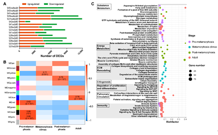 为了探讨以上科学问题,中国科学院成都生物研究所江建平研究员团队科研人员以饰纹姬蛙为研究对象,综合转录组测序和透射电镜技术系统地观测研究了变态发育过程中肺的微观结构变化,功能蛋白的转录变化以及潜在的分子调控机制。