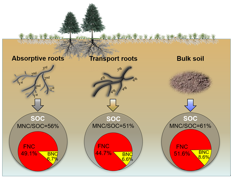 成都生物所在吸收根/运输根差异化调控森林土壤有机碳化学组成和来源中获新进展