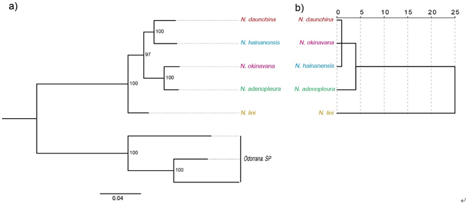 图1 系统发育树(a)及5种广告鸣叫的层次聚类结果(b)