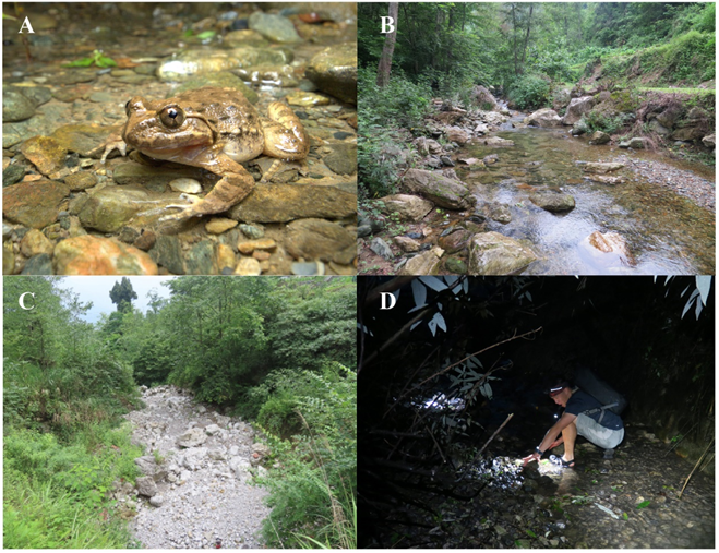 图1:棘腹蛙种群调查:A)物种生态照;B)典型栖息地;C)栖息地干涸;D)野外调查
