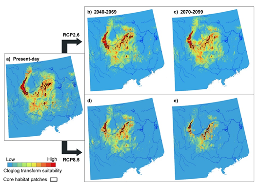 图2:气候变化背景下棘腹蛙适宜栖息地与核心斑块的空间格局