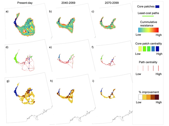 图3:气候变化背景下棘腹蛙适宜栖息地核心斑块间连通性的变化格局