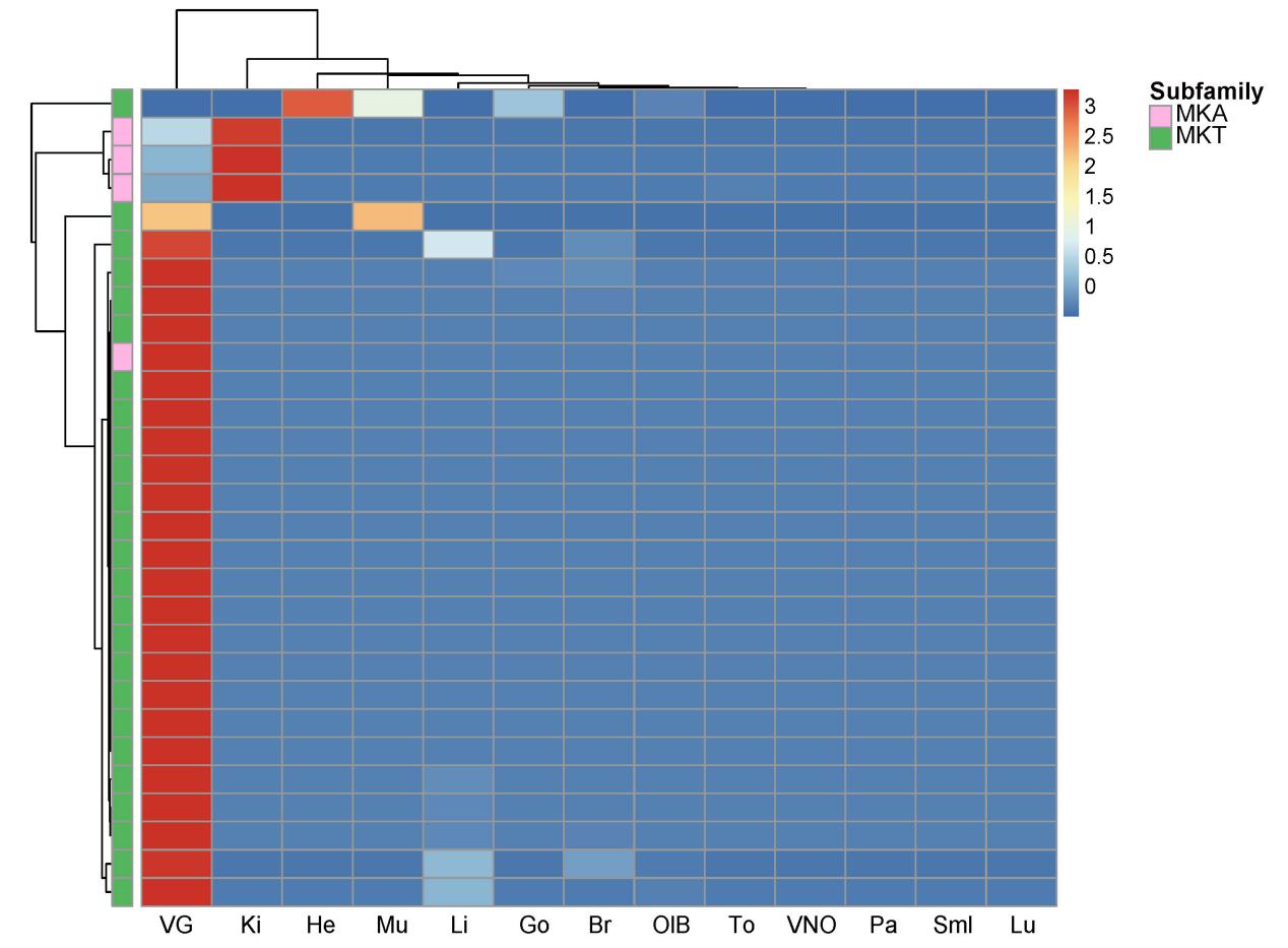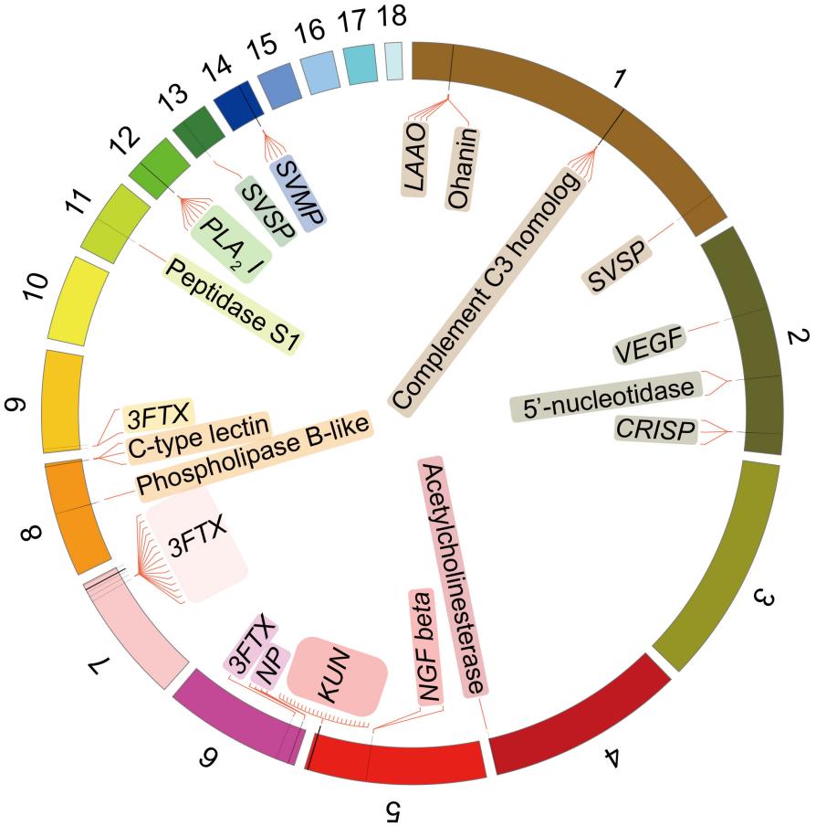 研究共发现118个银环蛇毒素基因拷贝,分属17个毒素家族(图1),其中三指毒家族(three-finger toxin, 3FTX),I型磷脂酶A2毒素家族(type I phospholipase A2, PLA2 I)和蛇毒Kunitz型丝氨酸蛋白酶抑制剂家族(snake venom Kunitz-type serine protease inhibitor, KUN)的基因拷贝数分别为30个、9个和31个,而这些拷贝的转录表达量可占所有毒素基因表达量的90%以上。