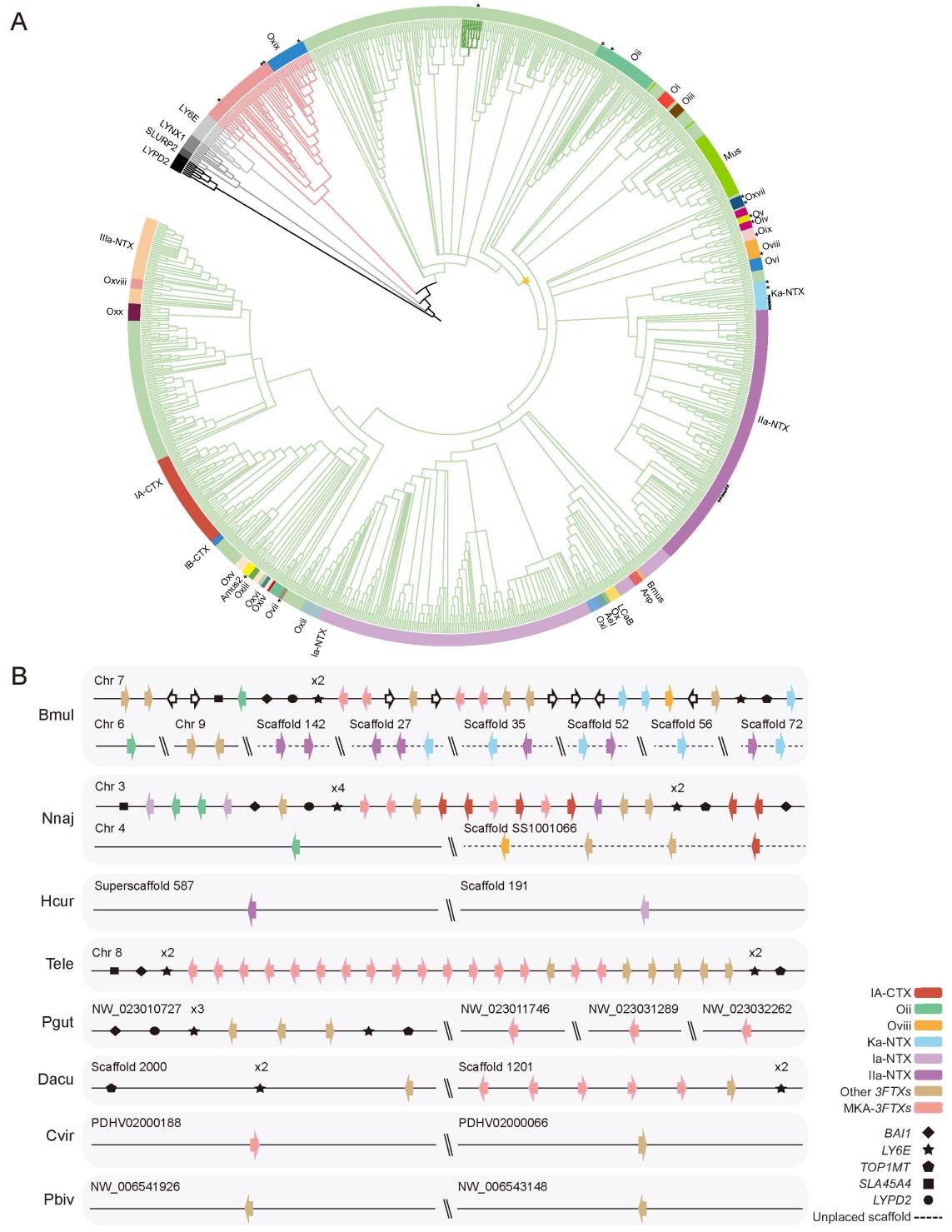 3FTX系统发育及共线性关系。(A3FTX系统发育最大似然树。(B8种蛇类物种的3FTX基因家族簇及其旁侧保守锚定基因。