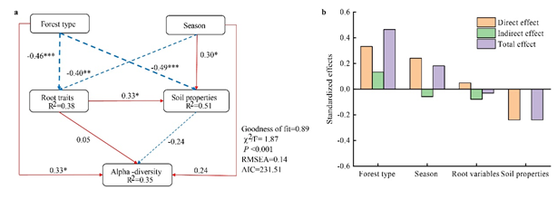 图3. 结构方程模型SEM分析树种和季节对土壤真菌多样性的影响(a), 偏最小二乘路径模型得出的标准化直接和间接影响(b)