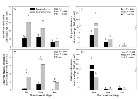 图1 阔叶树和针叶树对土壤线虫功能群丰度的影响及其在演替各阶段的变化