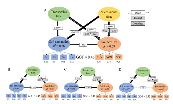 树木种类和功能类型对土壤养分含量具有显著的调控影响,并且考虑到土壤生物群落在土壤碳固存及养分矿化等方面的重要作用,不同树种对土壤养分的差异性影响很可能与土壤生物群落的间接介导作用密切相关。作为土壤生态系统中最重要的组成部分之一,土壤线虫可直接或间接参与有机物的分解和营养物质的矿化,然而,关于树种类型(如阔叶树和针叶树)是如何影响土壤线虫群落,进而影响土壤养分的,目前还尚不清楚。深入探讨阔叶树和针叶树对土壤线虫群落的差异性影响及其在森林演替不同阶段的变化,将有助于我们进一步了解森林土壤养分(尤其是土壤碳和氮)的封存潜力和机制。