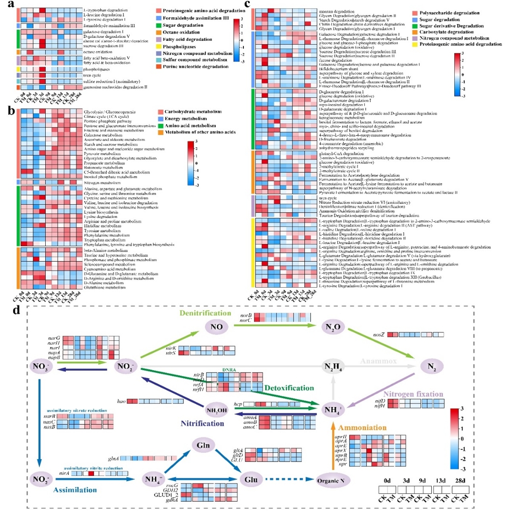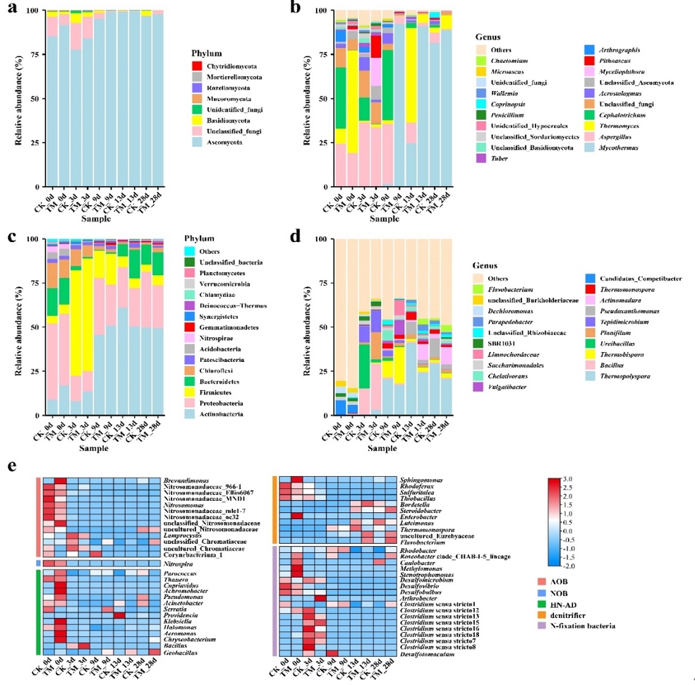 基于此,中国科学院成都生物研究所污染生物治理团队筛选获得了3株具有高氨氮转化率的高温异养硝化菌,将其制备成菌剂接种到污泥气流膜堆肥中,通过堆肥过程中的氮素变化情况、微生物群落组成以及碳氮代谢通路的来解析外源添加的微生物对堆肥过程的影响。研究结果表明,接种菌剂将高温期从4天延长至7天并提高了堆体的温度,有机质的降解率提高了14.06%,促进了堆肥的腐殖化进程。并且菌剂组的NH3累积排放量减少了34.64%,而堆体中NO3--N的含量是对照组的2.76倍,表明接种的菌剂能够有效减少堆肥产品中的氮素损失。此外,菌剂的添加还显著影响了堆肥过程的微生物组成,菌剂组中多数有机质降解菌丰度增加而典型的病原真菌的丰度降低,这与维持高温期的温度有关。从氮转化微生物和功能基因分析,菌剂组中富集了大量的异养硝化菌,增强了内源性微生物的硝化作用而抑制了反硝化作用,表明接种菌剂优化了堆肥过程的群落结构,使其成为一个有机质快速降解和氮素保留的高效系统。这些结果显示在污泥气流膜堆肥过程中联合使用高温异养硝化菌是一种提高堆肥效率、增加产品肥效、减少臭气污染的有效策略。