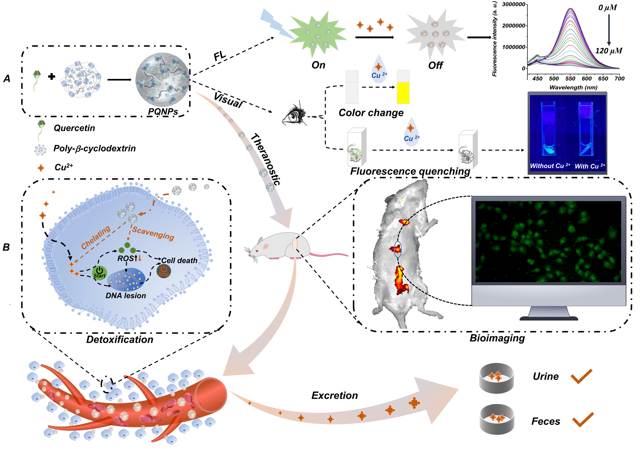 图1 用于体外和体内铜离子特异性识别和去铜毒的仿生多功能诊疗纳米粒子( PQNPs)的设计和应用