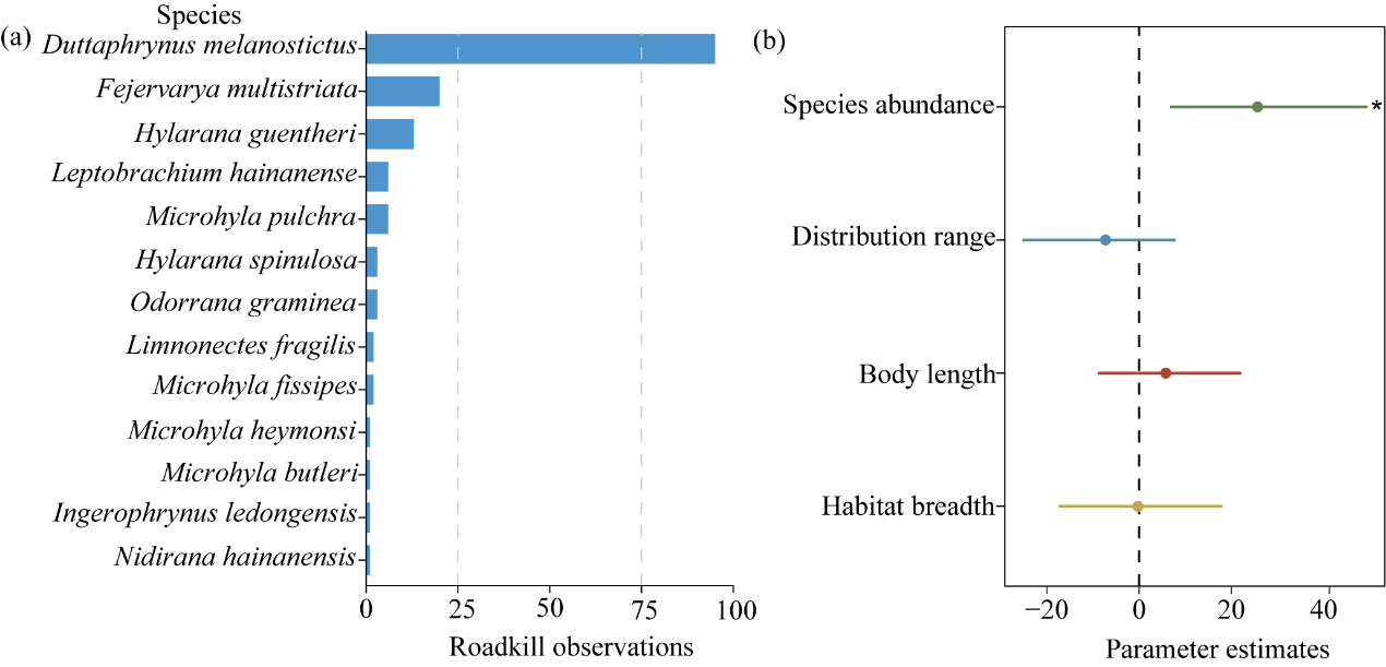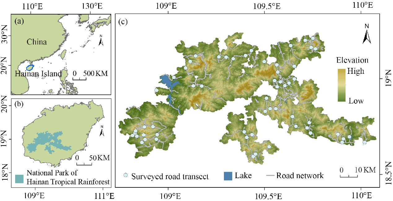 许多热带雨林地区正经历着人口的快速增长和社会经济的快速发展,各种开发活动促进了热带雨林中道路的不断扩张,改变了区域原有的环境条件,导致野生动物面临着日益增加的道路致死风险。两栖动物对环境依赖性强、迁移能力弱,在全球范围内面临着种群下降甚至局部灭绝的风险。道路致死叠加了两栖动物所面临的生存威胁,是导致其种群下降的最主要人为因素之一。然而,与其它脊椎动物类群(如鸟类和哺乳类)相比,两栖动物体型较小,其道路致死个体检测率较低,且致死个体会在短时间内消失。这些因素使得两栖动物的道路致死风险被严重低估,在道路致死研究中也往往被忽视。此外,热带雨林野生动物道路致死的相关研究主要集中在南美热带雨林,对亚洲热带雨林的研究严重不足。