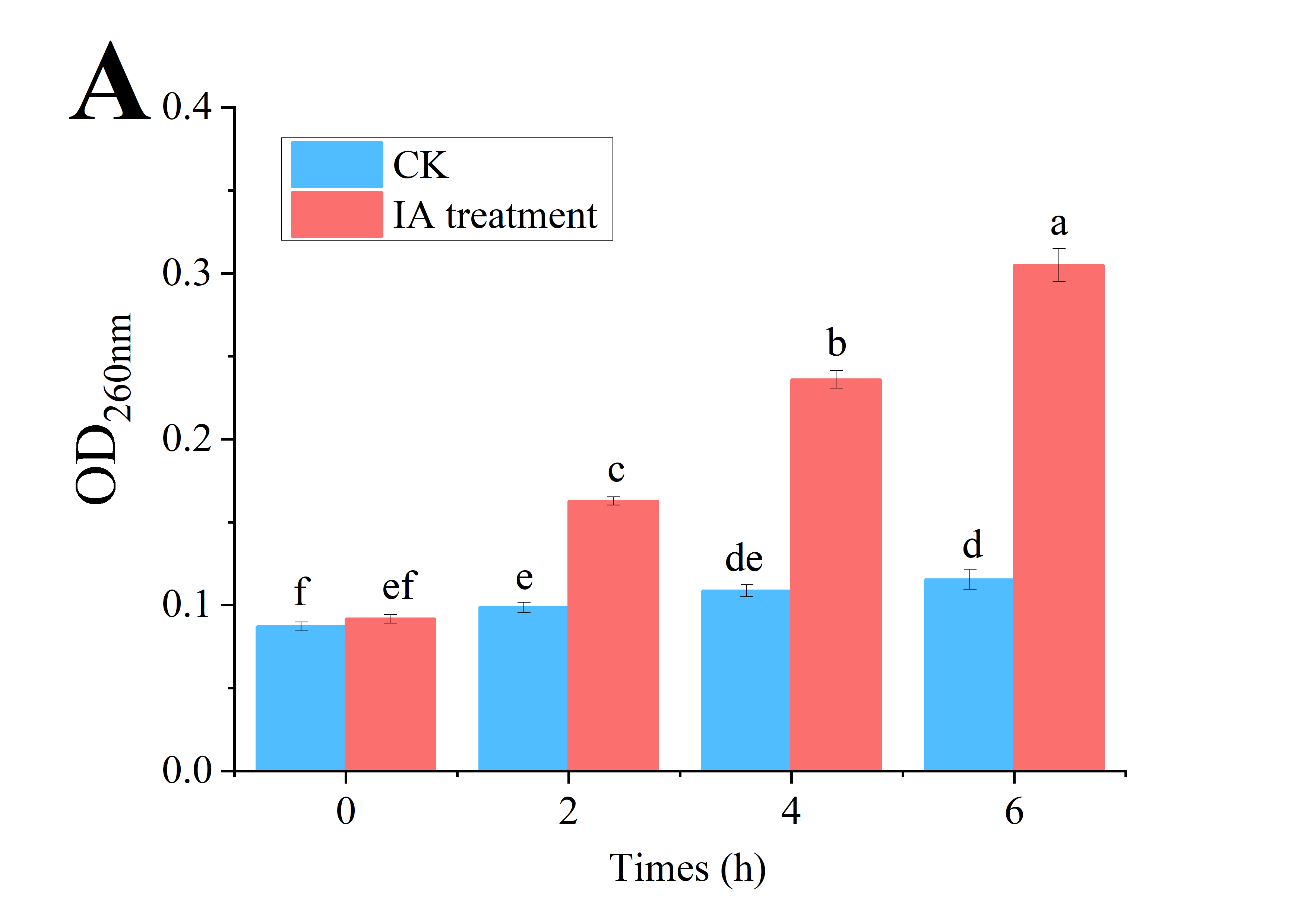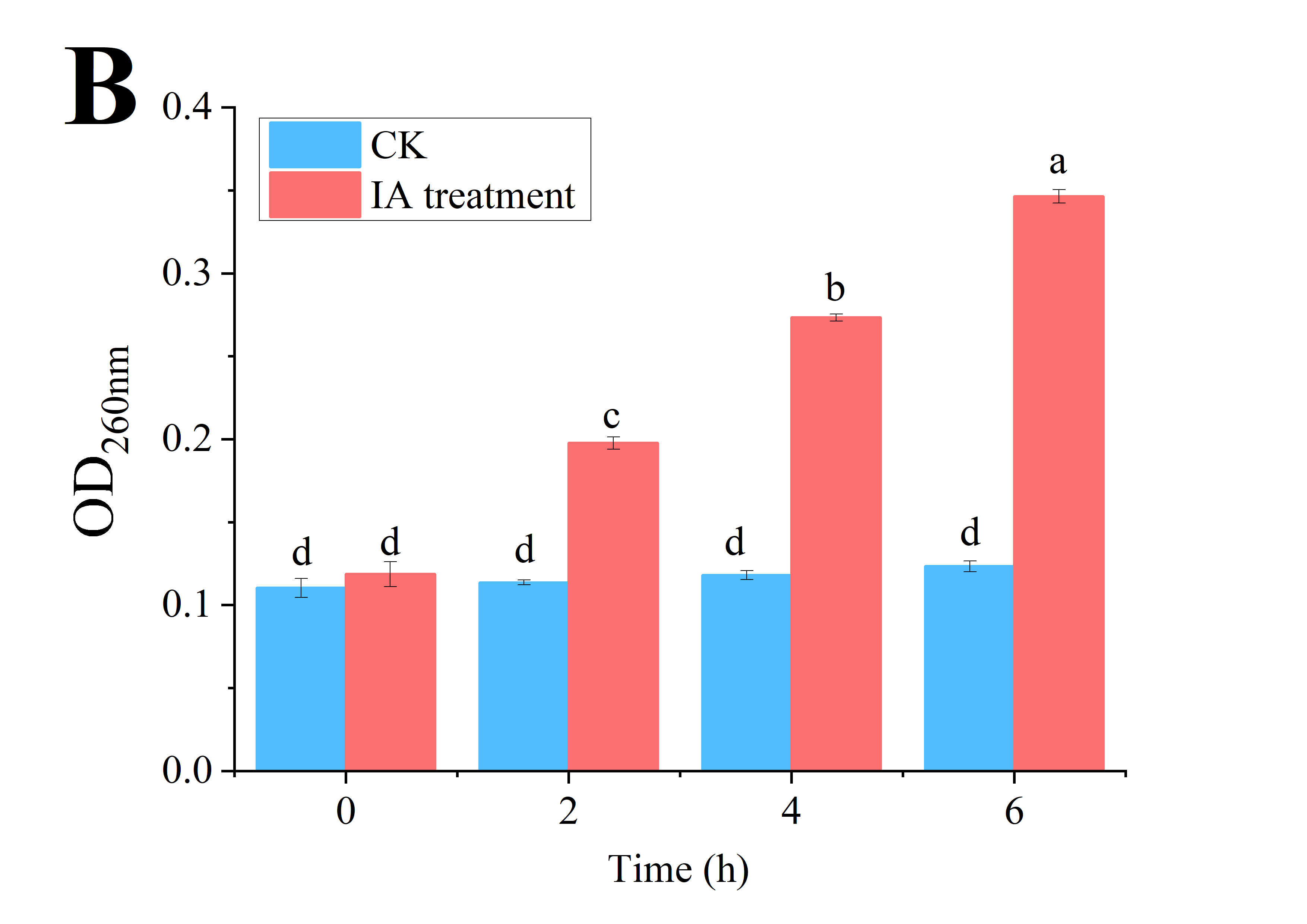 IA处理损伤S. cerevisiae细胞的DNA:经IA处理后,可检测到胞外核酸物质显著增加;且经IA处理后的细胞中,次黄嘌呤、鸟苷等水平显著下降,提示酵母DNA受损并激活了嘌呤补救合成途径;细胞中5-甲基胞嘧啶水平升高,提示DNA受损,诱导染色体稳定性提升的甲基化机制被激活。