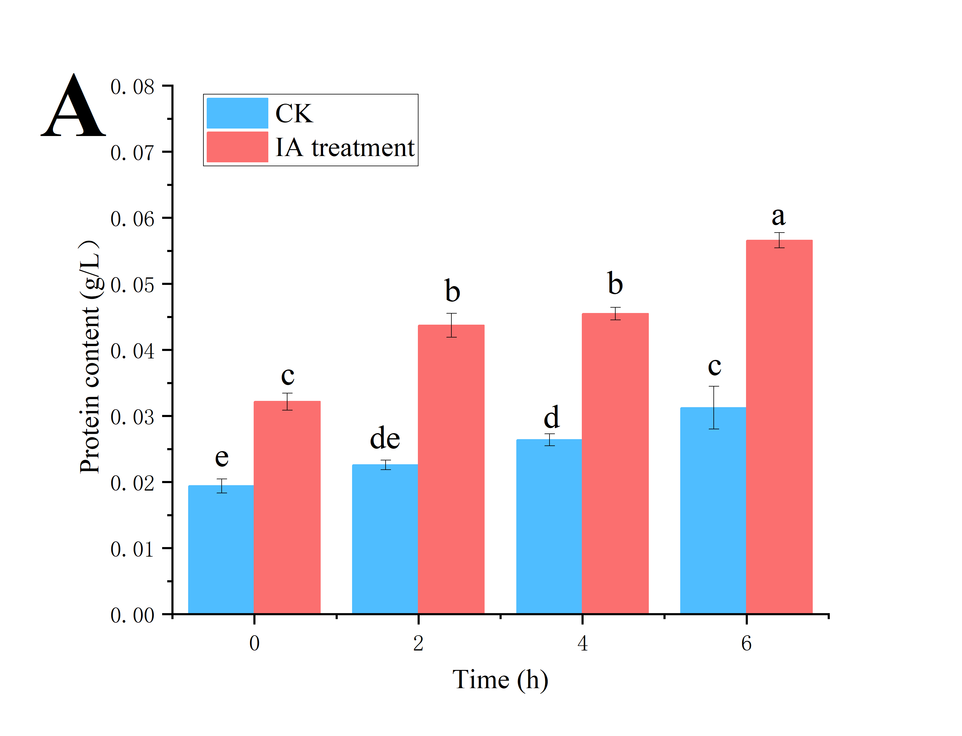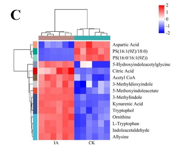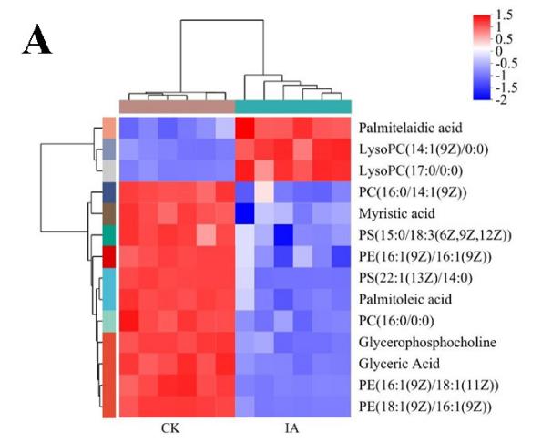 IA处理可引起S. cerevisiae细胞膜紊乱:经IA处理后,酵母细胞中磷脂酰乙醇胺(PE)、磷脂酰胆碱(PC)等膜磷脂含量显著降低,如棕榈油酸等脂肪酸含量也出现明显下滑,可能导致细胞膜流动性和稳定性失衡。离子通道调节剂3',5'-环鸟苷单磷酸含量的显著提高,也导致离子通道活性和跨细胞膜的离子转运功能的失衡。