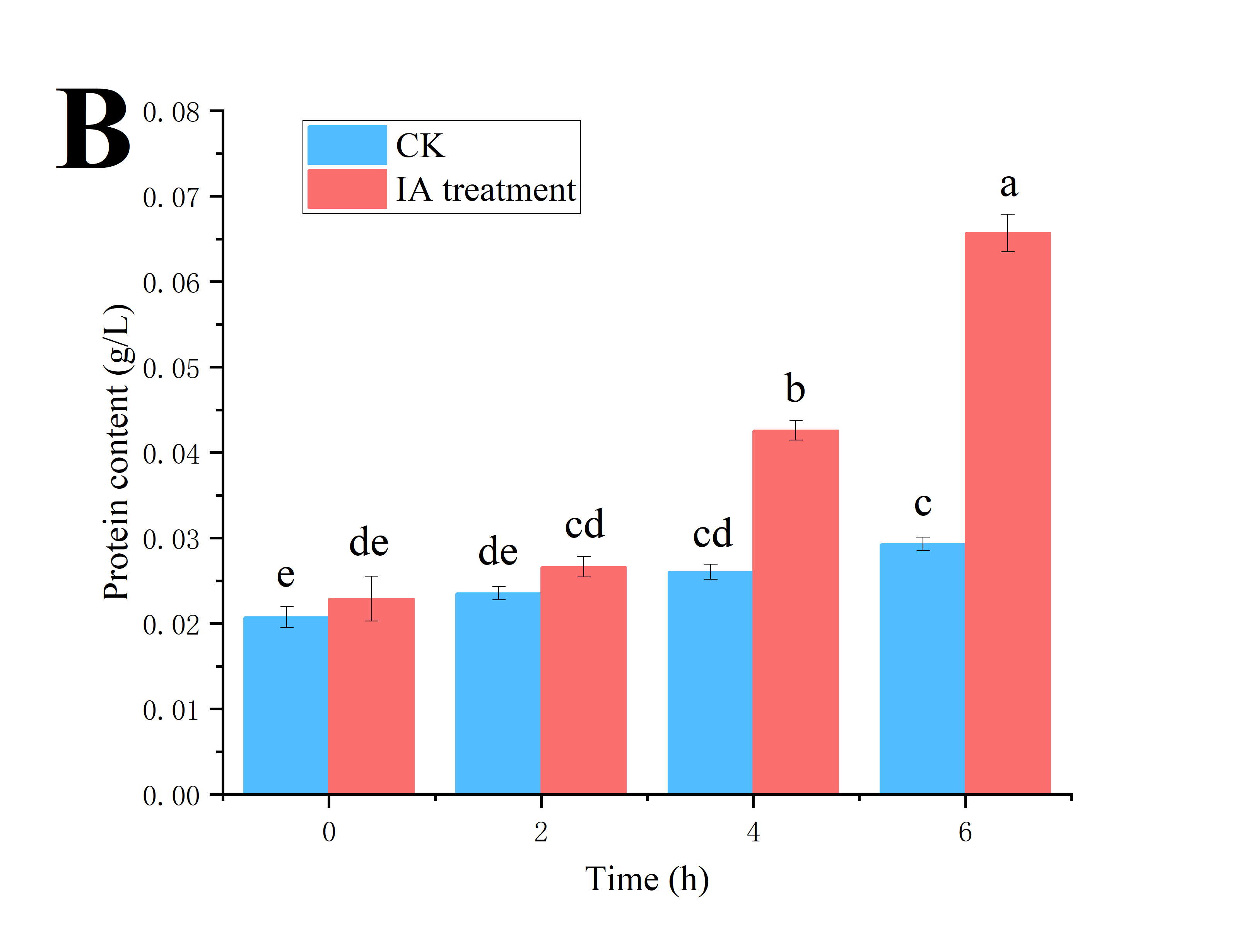 图2. MIC浓度IA不同时间处理,对S. cerevisiae细胞(A),P. kluyveri细胞(B)中核酸和蛋白质渗出量的影响