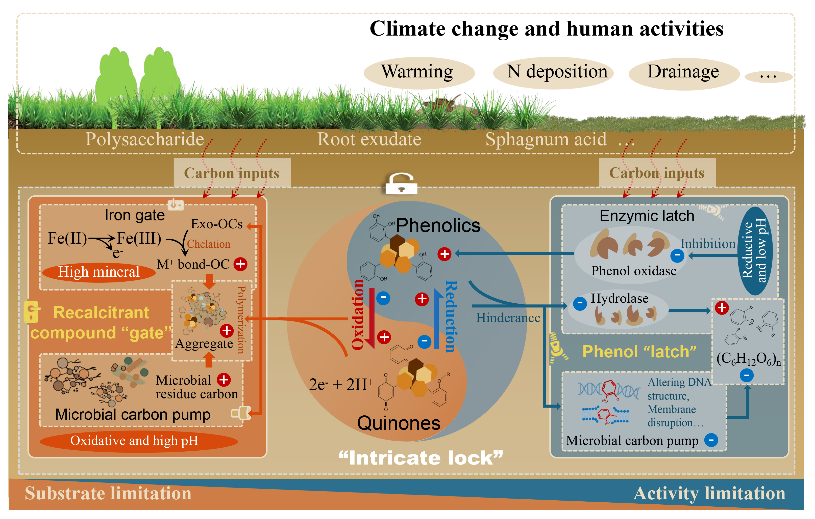 我们在酶闩理论的基础上形成了复杂碳“锁”框架,完善泥炭地土壤碳库稳定理论体系。在该框架中,酚类物质氧化产物-醌类物质通聚合和螯合作用(铁门理论)及微生物同化(微生物碳泵)形成难降解化合物的“门”;同时醌类物质还原为酚类物质,抑制不同氧化酶活性(酶闩理论)。复杂物质“门”持续形成大量复杂有机碳,而酚“闩”进一步限制微生物及其各种氧化酶活性,二者共同构成泥炭碳土壤碳库稳定的复杂碳“锁”框架。该框架受泥炭地土壤氧化还原电位、pH值、矿物含量及养分有效性的共同调控。