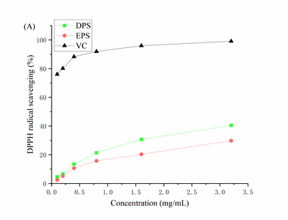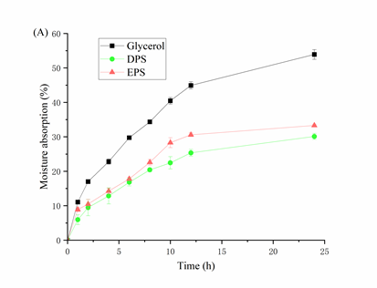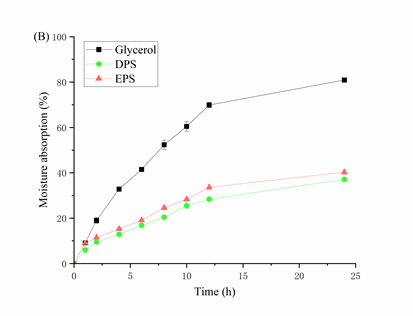 功能性检测表明,该EPS具有卓越的保湿性与抗氧化活性:在81%湿度环境下24小时吸湿率超50%;在3.2 mg/mL浓度下,对DPPH自由基、羟基自由基和ABTS?自由基的清除率分别达34.33%、48.1%和50.27%。该EPS低分子量特性赋予其快速吸湿能力,而丰富的羟基与氨基基团是抗氧化活性的关键来源。