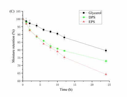 图3. 在相对湿度为43%(A)和81%(B)时,EPS随时间的吸湿率,以及在43%湿度下EPS随时间的保湿率(C)