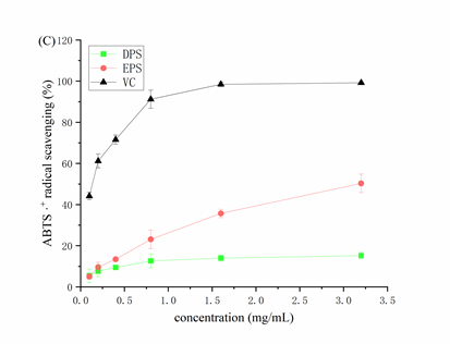 图4. 不同浓度EPS对DPPH自由基(A)、羟基自由基(B)和ABTS+自由基(C)的清除能力。