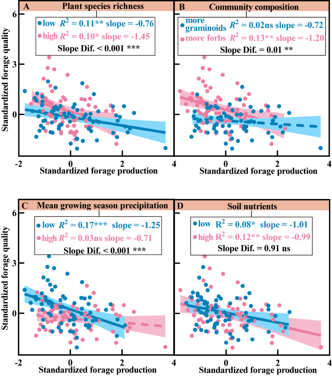 牧草产量和品质存在普遍的权衡关系,二者对群落特征和环境因子的响应存在差异,因此牧草品质储量的变化与牧草产量的变化并不完全一致。关于产量和品质的权衡关系及品质储量的影响因素,本研究发现(图4-6):(1)植物丰富度的增加加剧了产量和品质的权衡,并降低了品质储量。(2)群落中禾草比例的增加可打破产量和品质的权衡,提高了品质储量。(3)气候因子中,多年生长季平均降水量显著影响着产量和品质的关系。随着降水量的升高,产量和品质间的权衡关系被打破,但对品质储量无显著影响。(4)土壤养分的升高未显著影响产量和品质的权衡关系,但可提高牧草的品质储量。这些研究结果深化了对牧草供给功能格局及其影响机制的理解,可为青藏高原高寒草地的管理和可持续发展提供理论依据。