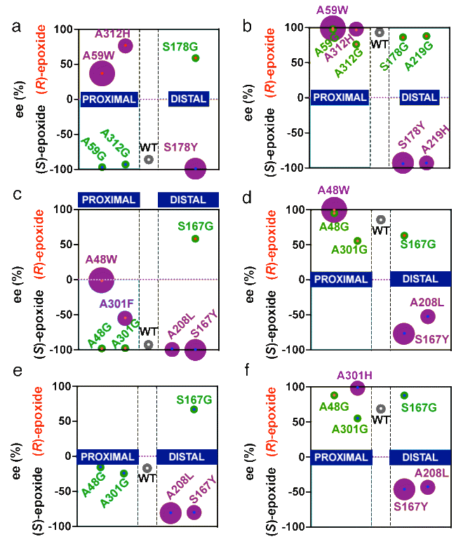 图3. SeStyA(左)及其突变体(右)立体选择性催化不同烯烃环氧化