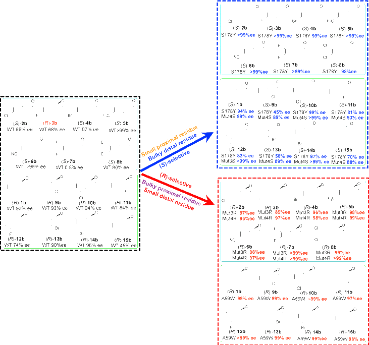 在该“拔河”模式立体控制机制的指导下,研究团队深入地分析了各位点间的协同效应,并成功构建了一系列针对不同类型化合物具有优异的(R)-或(S)-立体选择性的突变体(图3)。