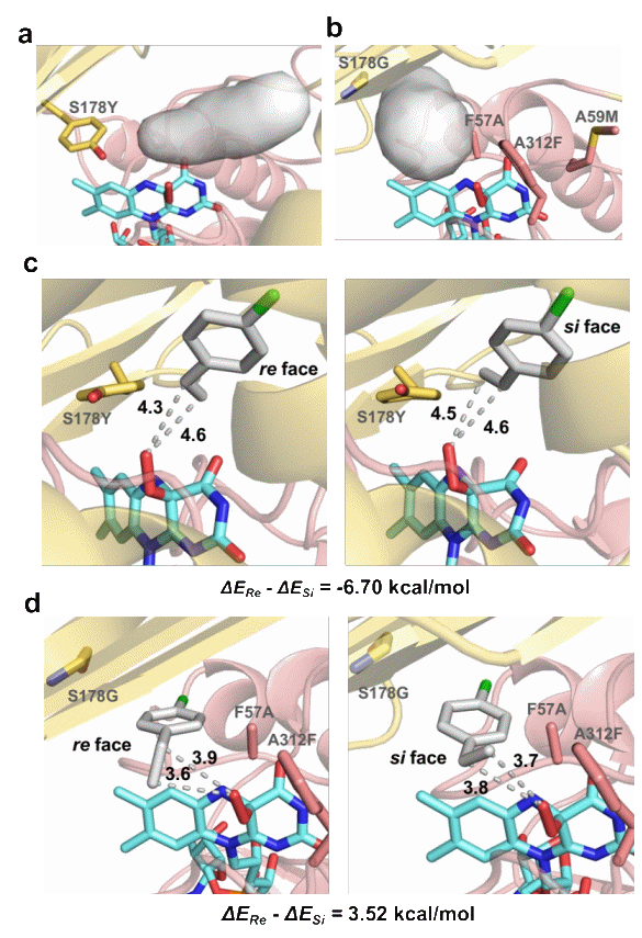 与此同时,通过分子动力学模拟阐明了该“拔河”模式的分子基础。结果显示:底物在含大远端突变体S178Y中以Re-face构型结合的自由能低于Si-face构型,生成(S)-环氧产物;而底物在含大近端小远端突变体Mut4R(S178G/F57A/A312F/A59M)中以Si-face构型结合的自由能低于Re-face构型,生成(R)-环氧产物(图4)。因此,底物在酶催化活性中的结合构型决定了该酶催化的立体选择性。