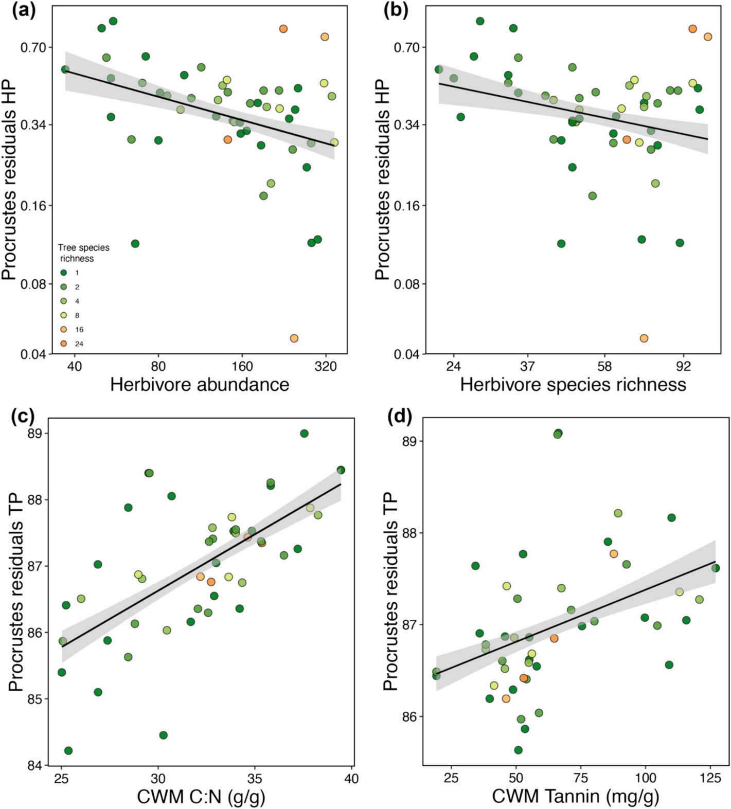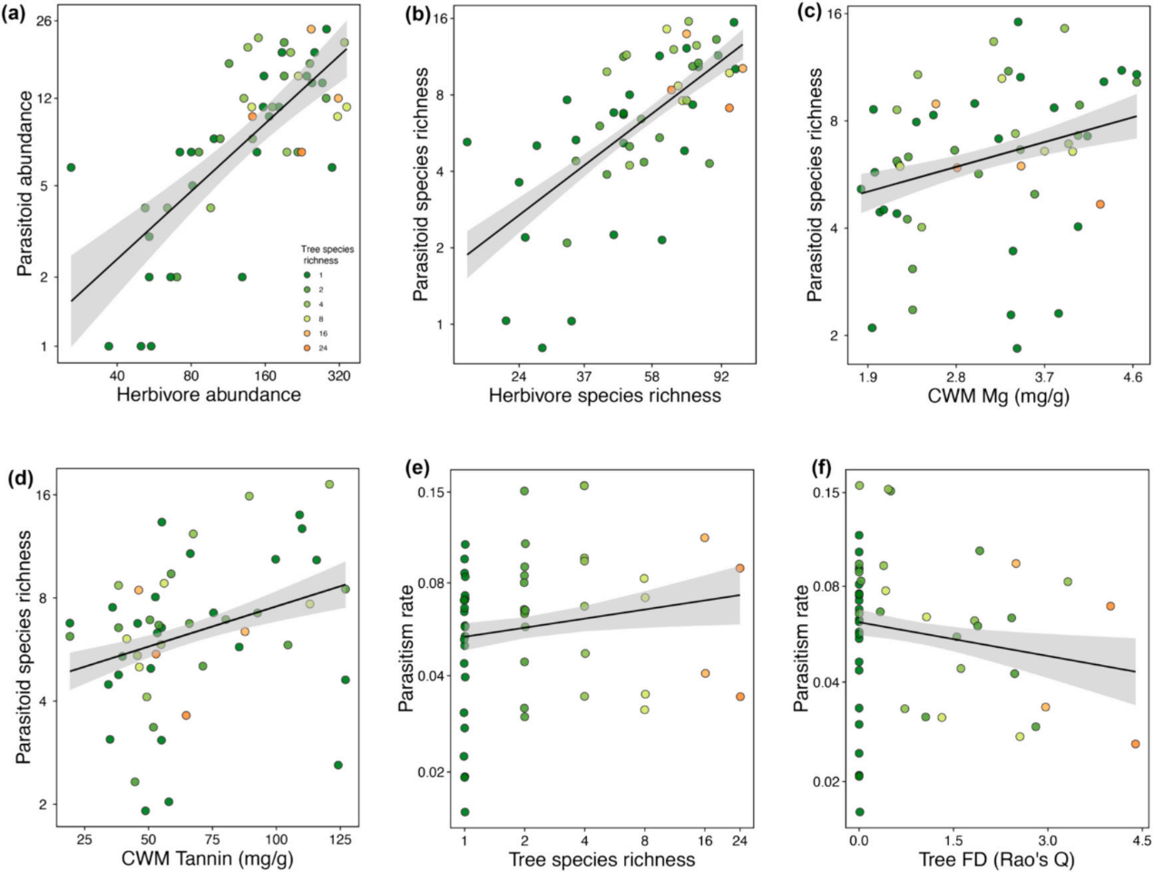研究结果表明,寄生蜂的丰度与物种丰富度均与鳞翅目幼虫的丰度和物种丰富度呈显著正相关(图1)。此外,寄生蜂物种丰富度还与寄主植物叶片镁含量和单宁含量的群落加权均值(CWM)显著正相关。寄生率在两种模型中均受树种丰富度显著正向影响,而树木功能多样性仅在以鳞翅目幼虫物种丰富度为预测变量的模型中表现出显著负效应(图1,图2)。部分低多样性样地也出现了较高的鳞翅目幼虫和寄生蜂多度与丰富度或寄生率,表明多营养级动态存在较大自然异质性,尤其在低树种多样性条件下寄生率波动更大。同时叶片钙含量的CWM与寄生率显著负相关,而单宁含量的效应则始终较弱且不显著。此外,研究还发现,鳞翅目幼虫群落的个体数量与寄生率呈负相关,表明寄生率可能受到鳞翅目幼虫密度制约的影响。寄生蜂与鳞翅目幼虫在群落一致性之间表现出高度一致性,反映了寄生蜂对宿主的专一性依赖(图3)