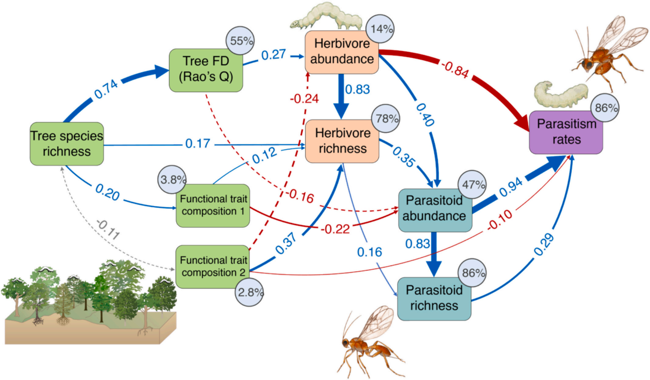 图 2 树种丰富度间接通过鳞翅目幼虫与寄生蜂群落影响寄生率的作用路径