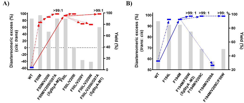 通过系统的定点突变与组合突变,研究团队揭示了“位阻调控”立体选择性的机制:第50位和第209位残基的大小共同决定了产物的立体构型?;诟没疲晒菇巳龉丶槐涮澹篠gStyA-M1 (F50L/V209I/G97A)具备顺式选择性 (dr > 99:1),SgStyA-M2 (F50M/V209I/G97A)同样为顺式选择性 (dr > 99:1),SgStyA-M3 (F194M/F50W)则表现出反式选择性 (dr > 1:99)(图2)。