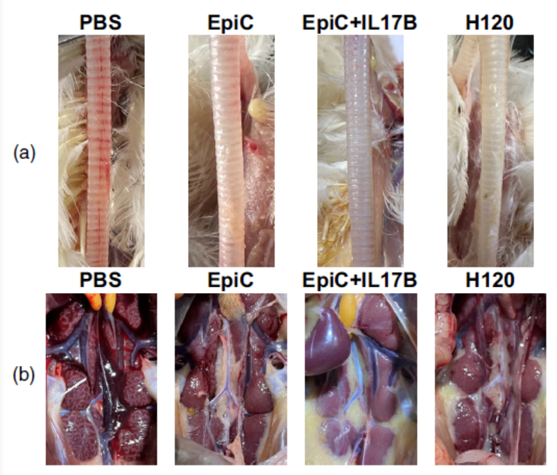 图1 PBS对照组(PBS)、EpiC疫苗组(EpiC)、EpiC+IL-17B疫苗组(EpiC-IL17B)和H120疫苗组(H120)鸡气管(a)和肾脏(b)的解剖学差异