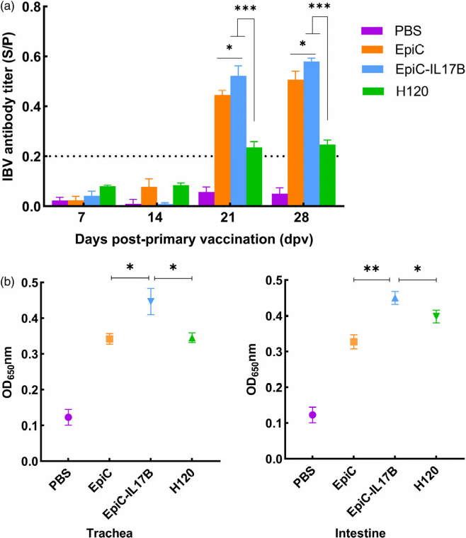 图2 针对IBV的体液和粘膜免疫反应。(a)血清IBV特异性IgG。(b)气管和肠道灌洗液中的IBV特异性sIgAs。