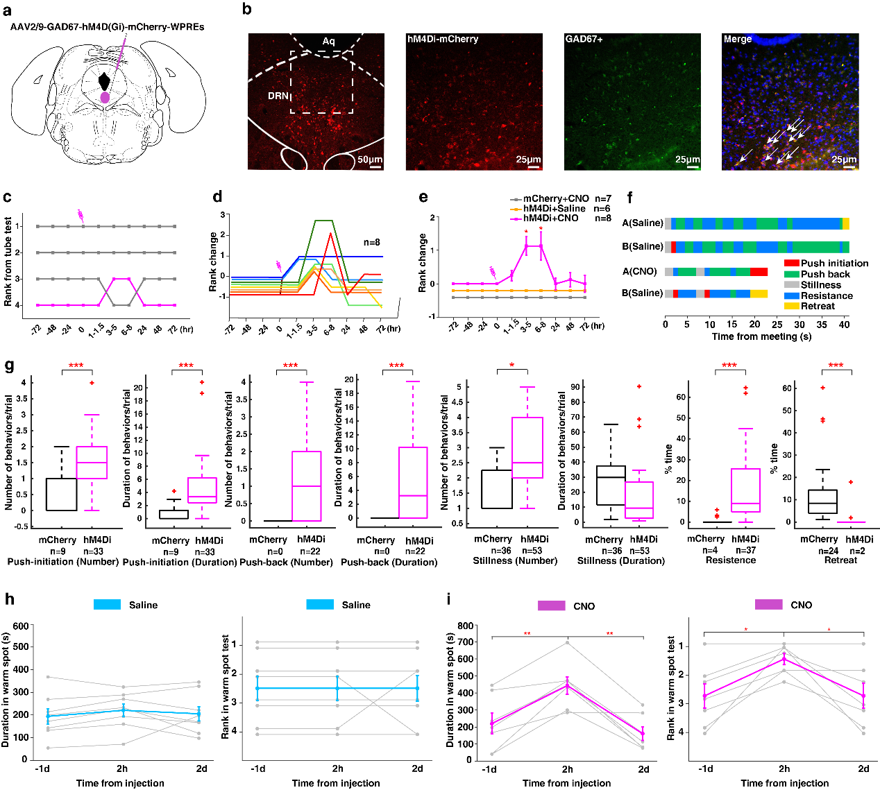 图3. 化学遗传抑制DRN GABA能神经元导致小鼠社会等级上升