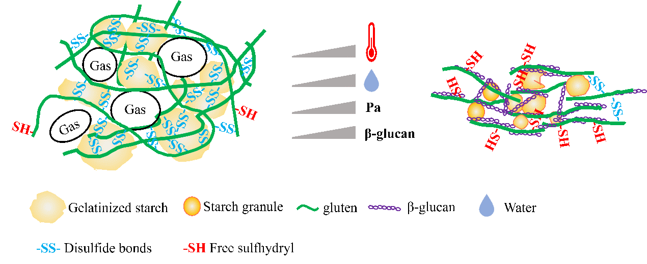 然而,造成添加β-葡聚糖的馒头与面包形态出现差异的关键因素并非面筋网络抑制本身,而是加热方式的不同。研究进一步发现,将添加β-葡聚糖的馒头由蒸制改为烘焙后,其结构塌陷现象消失。由此提出:β-葡聚糖虽干扰面筋网络形成,但由于馒头配方与制作工艺的特性,其面筋网络所受破坏更为严重;而在烘烤过程中,较高温度(150–180 ℃)有助于加固面筋网络,从而维持面包形态完整并实现体积小幅提升;相反,蒸制过程中的相对较低的温度(100 ℃)、高湿与高压环境则加剧了面筋网络的破坏,最终导致馒头结构崩塌。此外,研究还识别出高分子量、低(1→4)/(1→3)连接比例的β-葡聚糖结构更适用于烘焙面包体系。