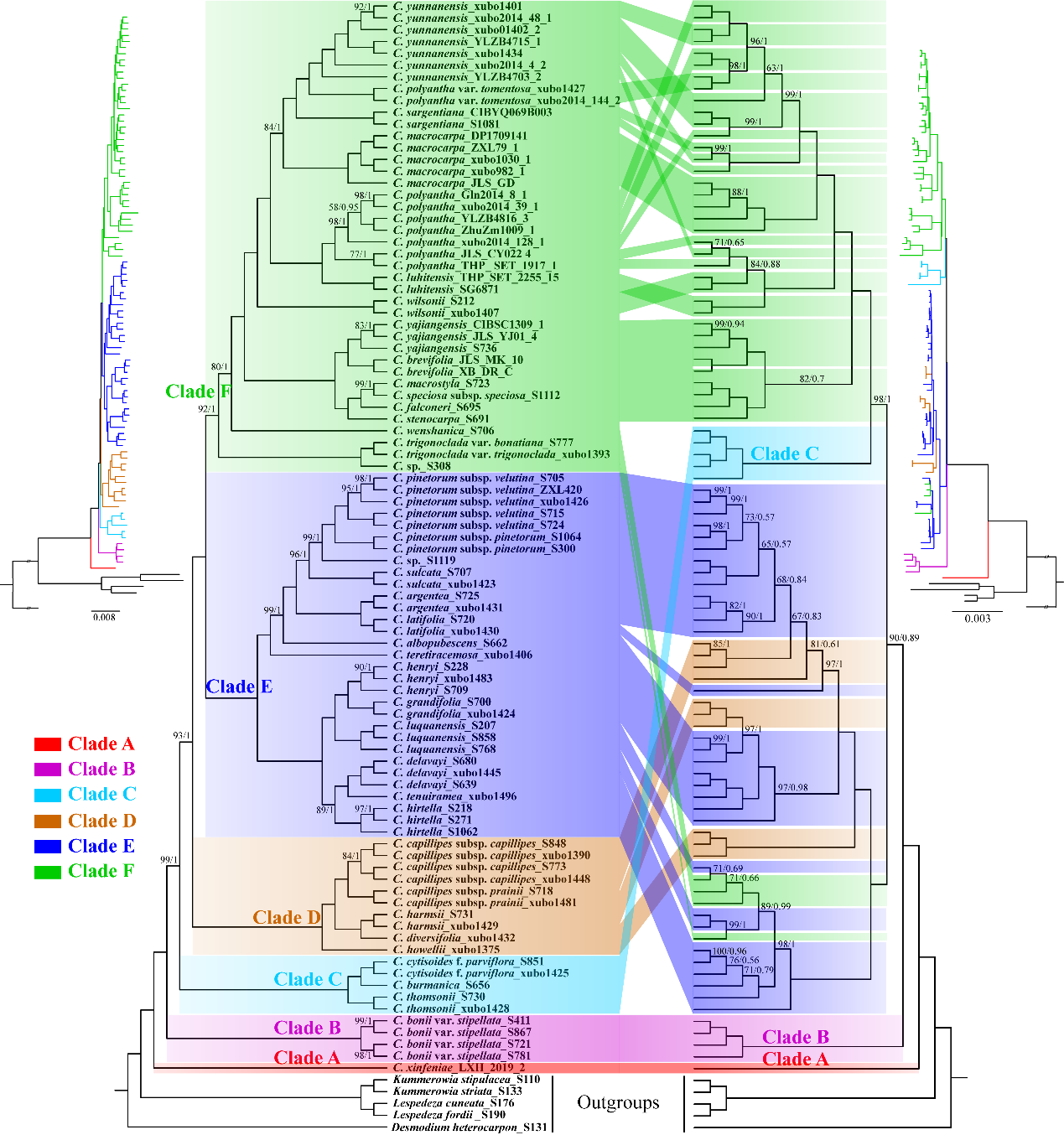 研究团队利用全基因组重测序技术,获取了77个叶绿体基因和1233个单拷贝核基因(SCGs)的高质量序列数据,构建了杭子梢属的系统发育框架,并估算了物种分化时间,重构了祖先分布区域,追踪了关键形态性状的演化过程。研究结果明确证实了杭子梢属的单系性,并将其与近缘属胡枝子属(Lespedeza)和鸡眼草属(Kummerowia)区分开来,划分出六个强支持的进化支,解决了此前未解的物种关系难题。研究发现,核基因与叶绿体基因系统发育树之间的冲突揭示了该属复杂的进化历史,可能受到叶绿体捕获和不完全谱系分?。↖LS)的影响。