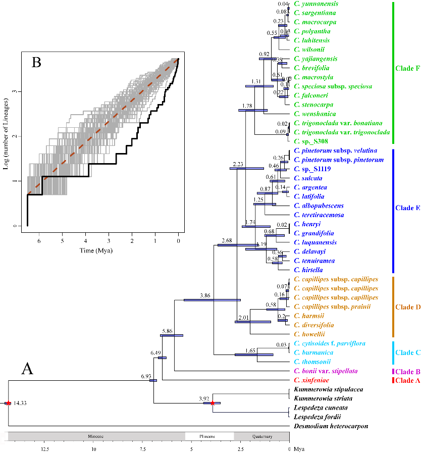 图3. A. 杭子梢属及相关类群的时间树。B. 杭子梢属的时序谱系(LTT)图。