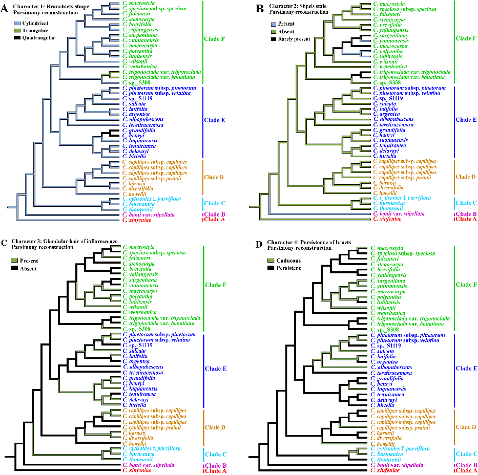 为了解关键形态特征的演化规律,研究通过最大似然法分析了四种关键形态特征(小枝形状、小托叶状态、花序腺毛有无及苞片宿存性)的演化模式,发现圆柱形小枝、无小托叶、无腺毛和早落苞片为祖先状态。这些特征在不同进化支中反复演化,显示出复杂的演化动态,为理解该属的适应性辐射提供了重要线索。