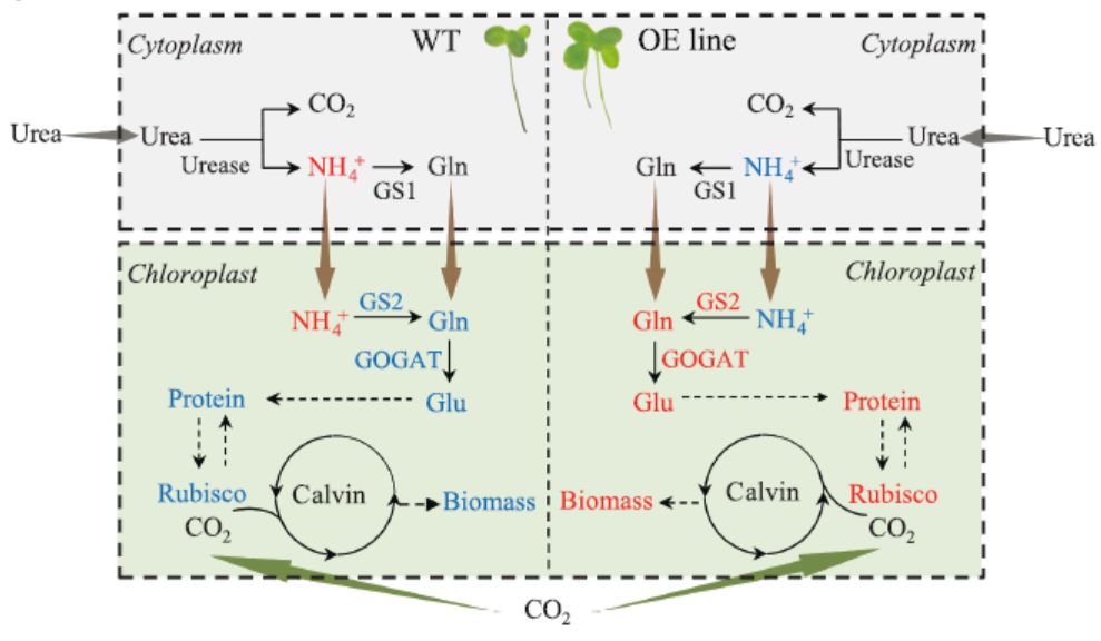 相同尿素供应下野生型和GS2过表达浮萍株系细胞质和叶绿体中氮同化的比较,蓝色字体代表功能酶活性降低和化合物含量减少;红色字体代表功能酶活性提升和化合物含量增加;实心黑线代表常见的路径;黑色虚线代表省略的步骤。