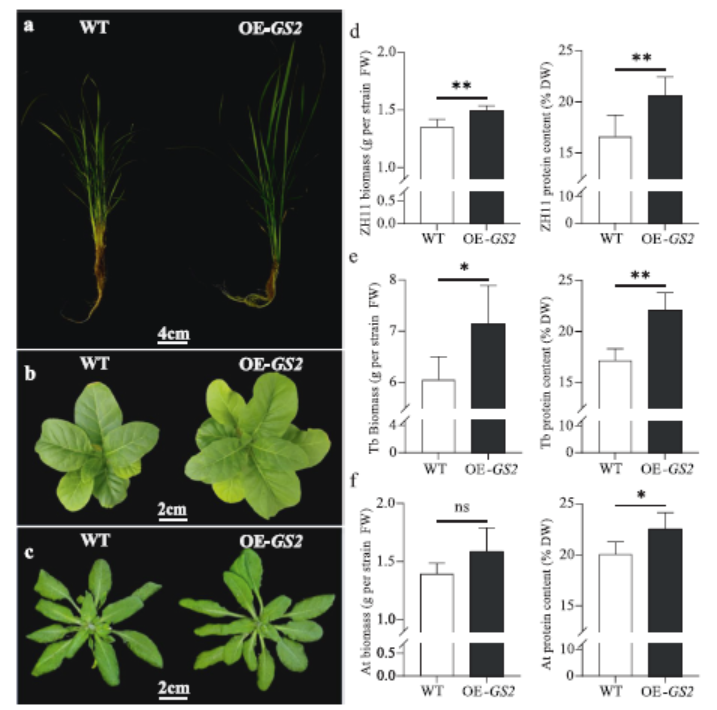 GS2过表达水稻、烟草和拟南芥的生物量和蛋白质含量