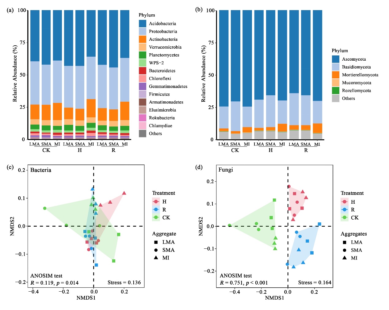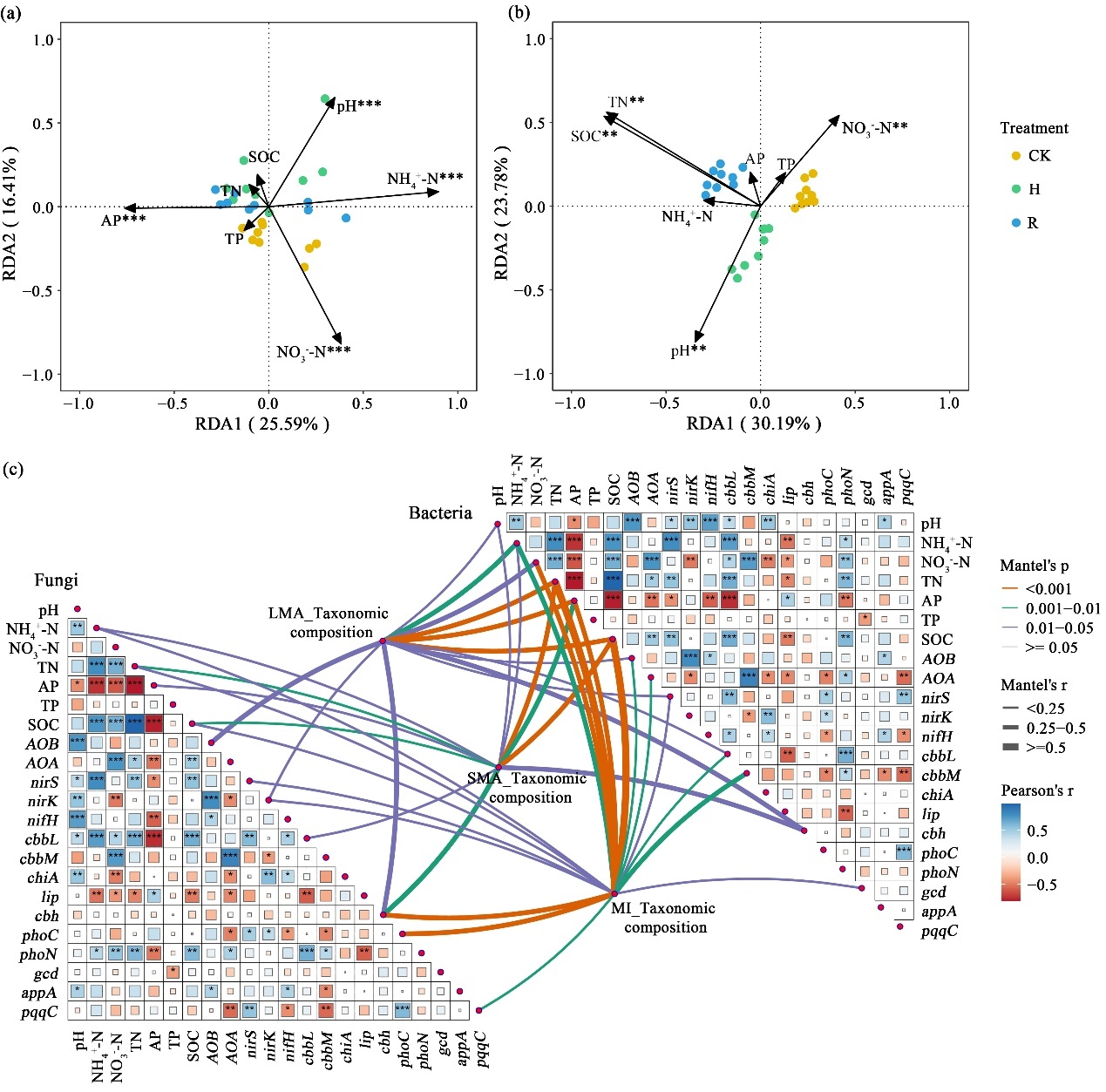 基于此,中国科学院成都生物研究所尹华军研究团队以青藏高原东部高寒针叶林的典型外生菌根共生树种—卧龙岷江冷杉(Abies faxoniana)为研究对象,采用内生长管技术区分根系和菌丝作用,探讨了根和菌丝活动对土壤团聚体中微生物组结构和功能差异及其参与的养分循环过程。研究结果表明:1)细菌群落对团聚体结构变化响应敏感,而真菌群落主要受根系和菌丝生长的调控;2)菌丝生长显著提升了碳降解和反硝化相关基因的丰度,并加剧了细菌网络复杂性;而与氨氧化作用相关的功能基因丰度在根际和菌丝际均呈下降趋势;3)菌丝际核心菌群以Sebacina和Laccaria为主,而根际显著富集了Sebacina和Mortierella。上述研究结果表明,根系与菌丝通过调控土壤团聚体结构,选择性地富集了特定功能微生物群。本研究深化了对森林根际/菌丝际微生物组特征与调控机制的理解,并为推动森林菌根生态学的发展提供了重要理论依据。