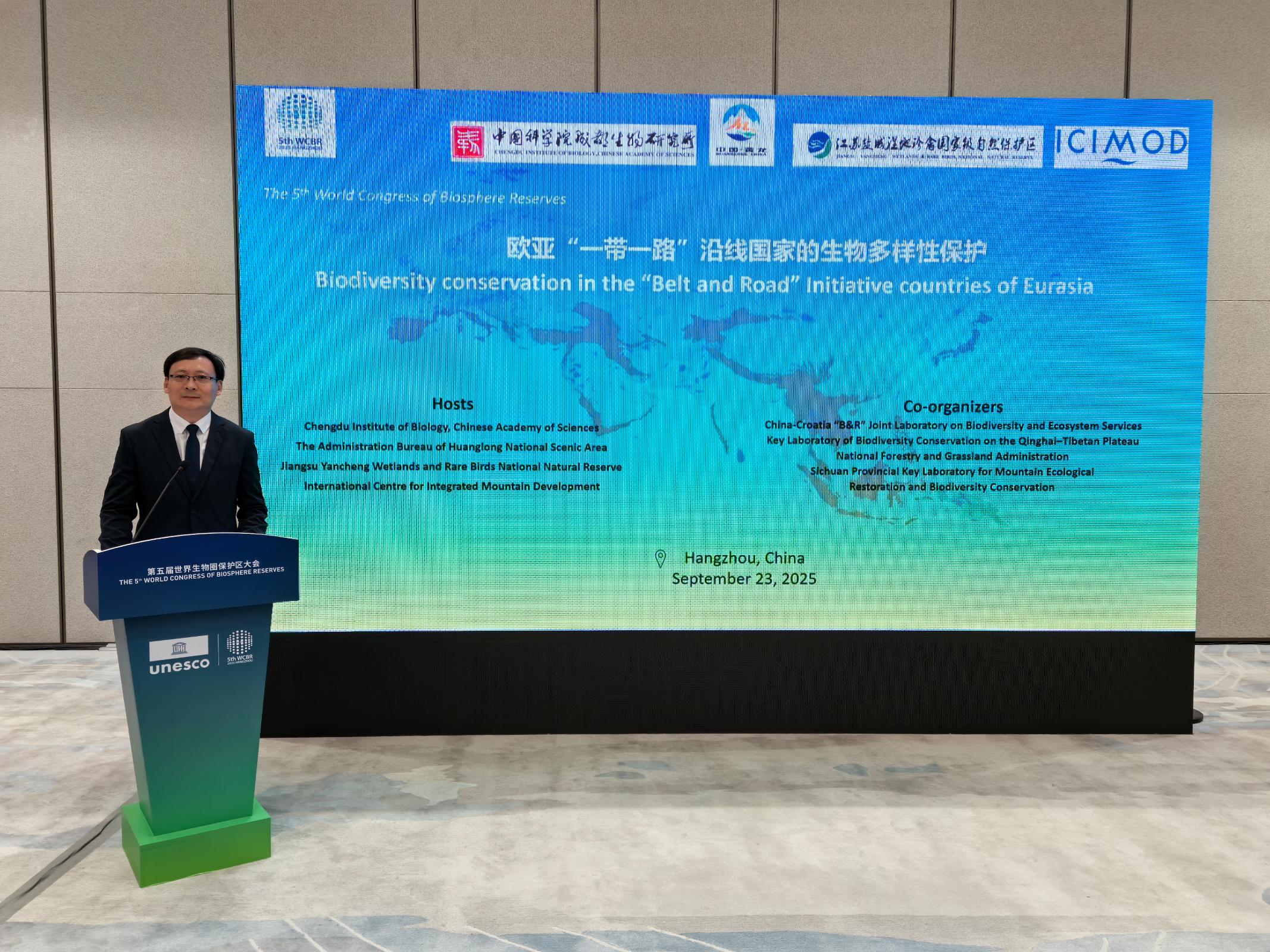 2025年9月23日,中国科学院成都生物研究所、黄龙国家级风景名胜区管理局、江苏盐城湿地珍禽国家级自然?;で?、国际山地综合发展中心(ICIMOD)联合主办的第五届世界生物圈保护区大会边会-“欧亚‘一带一路’沿线国家的生物多样性?;ぁ痹诤贾菟忱倏?,边会聚焦欧亚大陆生物多样性?;ぃ荚谕ü蒲Ю砺塾刖楣蚕?,推动跨国科研协作和?;ば卸?,为构建高水平生物多样性保护网络提供有力支撑。来自中国、克罗地亚、比利时、葡萄牙、伊朗、乌兹别克斯坦、尼泊尔、安哥拉等国家的约80名代表参会。
