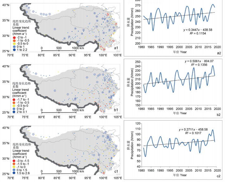 图4 1981-2019年青藏高原157个站点及区域年平均的不同等级降水量变化趋势. a-c分别为小雨、中雨、大雨. 散点图中圆圈表示通过95%置信度检验(应用与环境生物学报, 2022, 28 (4): 829-835)