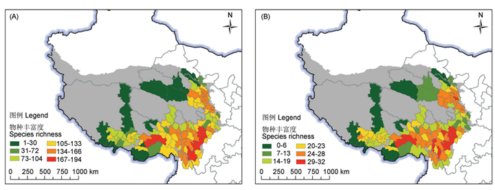 图5 当前气候条件下青藏高原农田杂草物种丰富度分布格局. A:所有种;B:单子叶杂草(应用与环境生物学报, 2022, 28 (4): 897-908)