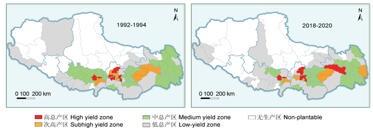 图6 基于1992-1994年及2018-2020年产量均值的西藏小麦生产空间分布格局(应用与环境生物学报, 2022, 28 (4): 945-953 )