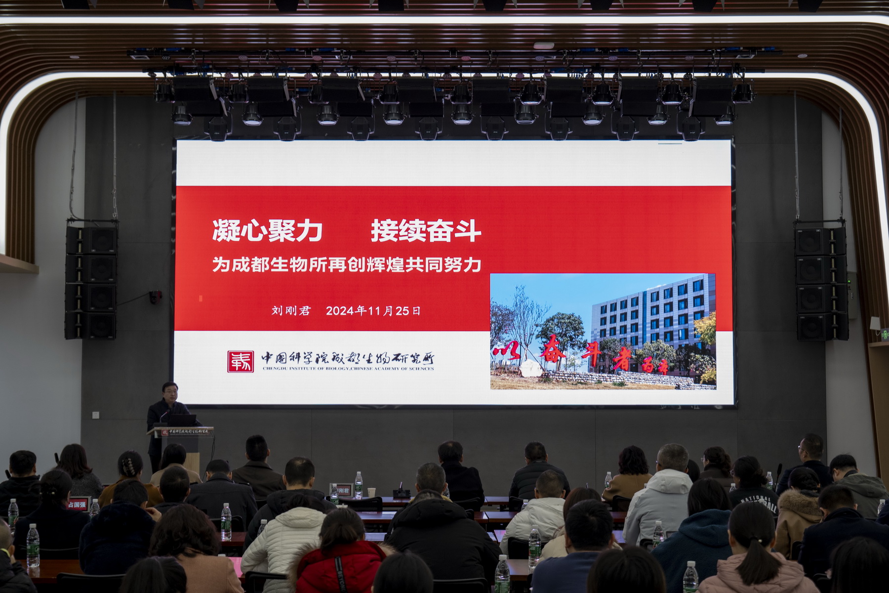 党委书记、副所长刘刚君以“凝心聚力 接续奋斗 为成都生物所再创辉煌共同努力”作专题报告。他以“变”和“不变”分析了当前国际国内形势、科技发展态势以及研究所面临的挑战与机遇。他指出,当前国际形势复杂多变,科技竞争日益激烈,但一代代成都生物所人“创新为民、科技报国”的初心始终未变,艰苦奋斗、自强不息的底色始终未变。他从解决“想干事”、推动“能干事”、保障“干成事”三个方面介绍了所领导班子和所党委近一年来围绕抢占科技制高点推进系统改革的系统思考以及在党建引领、文化建设、学科聚焦、人才引育、组织建设、资源配置、制度建设等方面的系列工作进展。他希望全所科研人员深刻学习领会习近平总书记系列重要指示批示精神,领会落实院党组系列决策部署,坚持目标导向和问题导向,深入系统思考,知行合一,加快由“在干什么”“想干什么”向“该干什么”转变,为我国实现高水平科技自立自强和研究所再创辉煌共同奋斗。